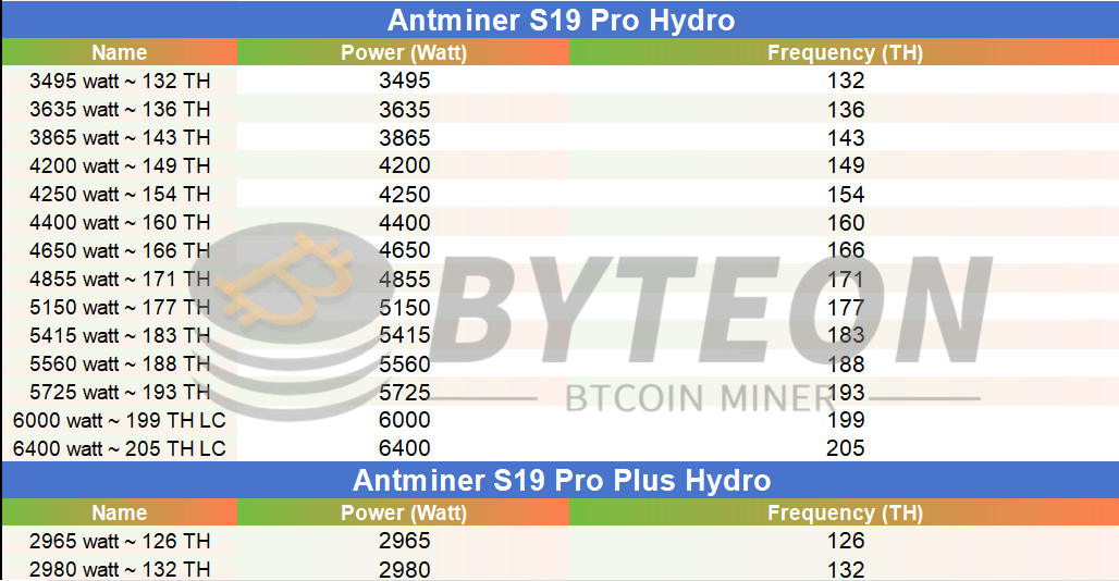 S19pro hyd series overclocking & downclocking data reference